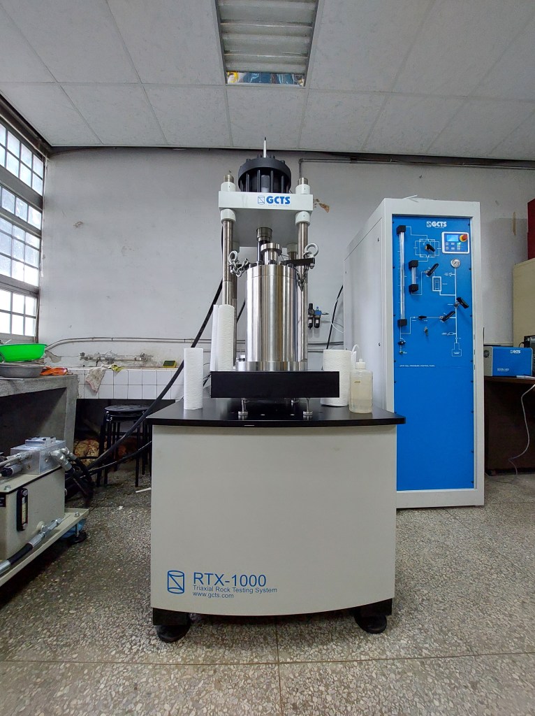 本設備為自動伺服(servo-controlled)裝置,藉由單壓、三軸等靜態試驗(static test),可模擬岩石在上部地殼的受壓環境,並取得岩石強度(strength)與彈性模數(elastic moduli)等力學參數。